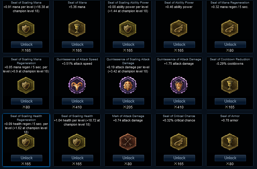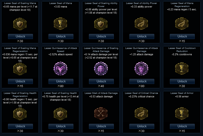 AD Flat marks 205x9 (1845) + Flat Armor seals 205x9 (1845) + MR/lvl glyph 205x9 (1845) + Flat AD Quints 1025x3 (3075) = 8610 IP必要となります。これは約6300のchamp 1体と、31501体分となります